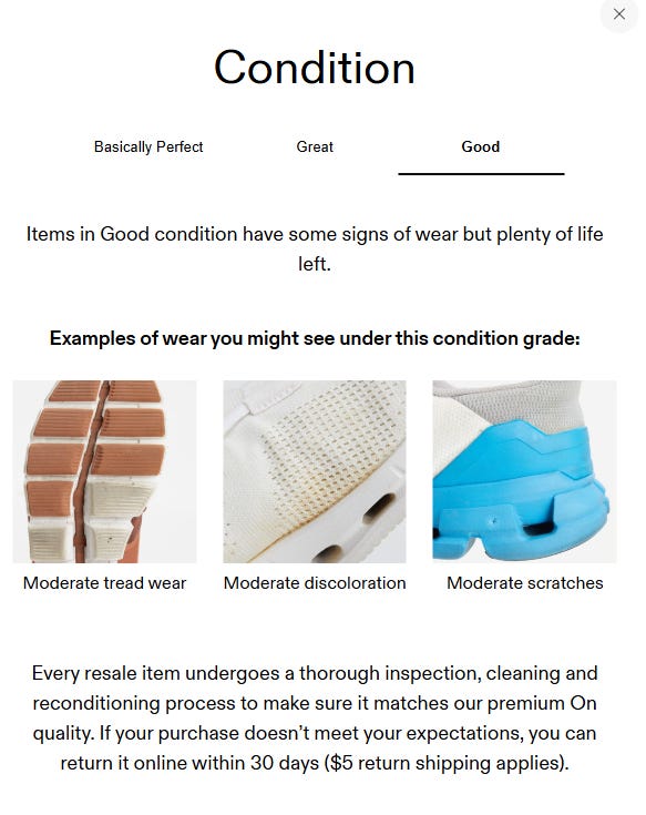 What will be interesting to watch is how far into the brand, price point, style matrix resale can extend. We are seeing dozens of name brands experimenting with their owned resale channel this year from Hanna Andersson (YES!) to Farm Rio (makes sense) to Marks and Spencer’s (really?). Even footwear brands like On Running launched resale programs. I can’t yet wrap my head around resale on used running shoes but, based on the description of conditions for used shoes on their site, the worst condition you’ll get is “Good” which may have moderate tread wear. And I don’t see much selection in that category (everything else is better).